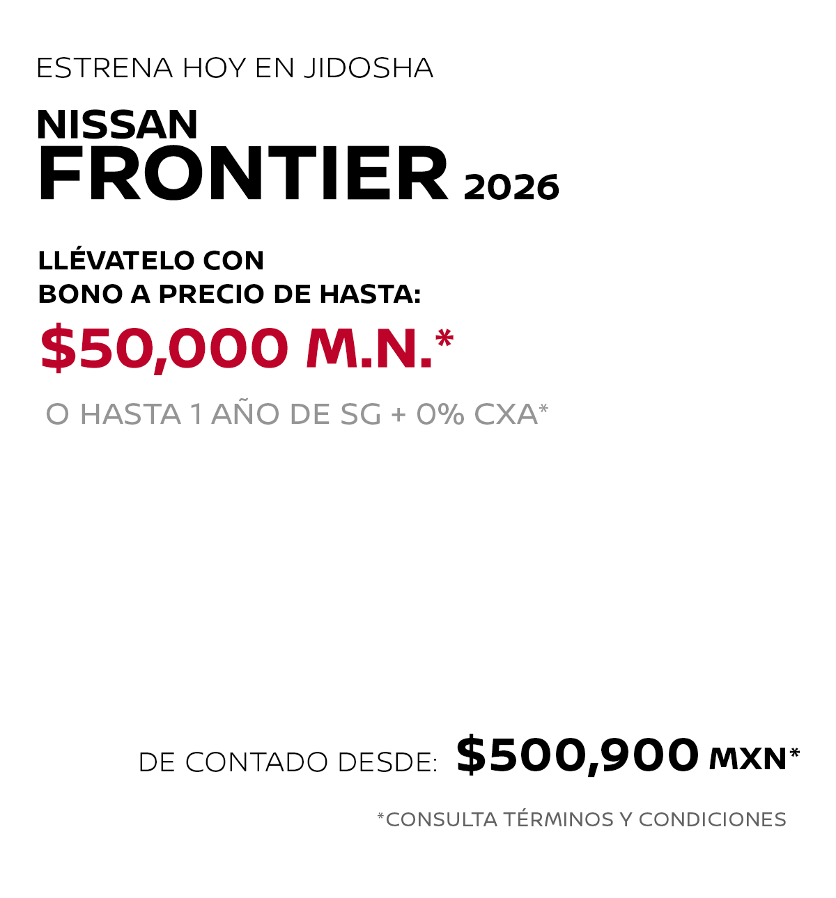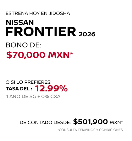* Nissan Mexicana, S.A. de C.V. puede modificar en cualquier momento y sin previo aviso esta información, consulta disponibilidad, términos y condiciones con tu Distribuidor Autorizado Nissan. La información proporcionada en el piso de venta del distribuidor autorizado Nissan, se entenderá como la correcta, veraz y final. ** Las imágenes son únicamente de referencia, algunas versiones no se encuentran disponibles en México o pueden cambiar según la versión. Consulta nivel de equipamiento y disponibilidad por versión en tu Distribuidor Autorizado Nissan.