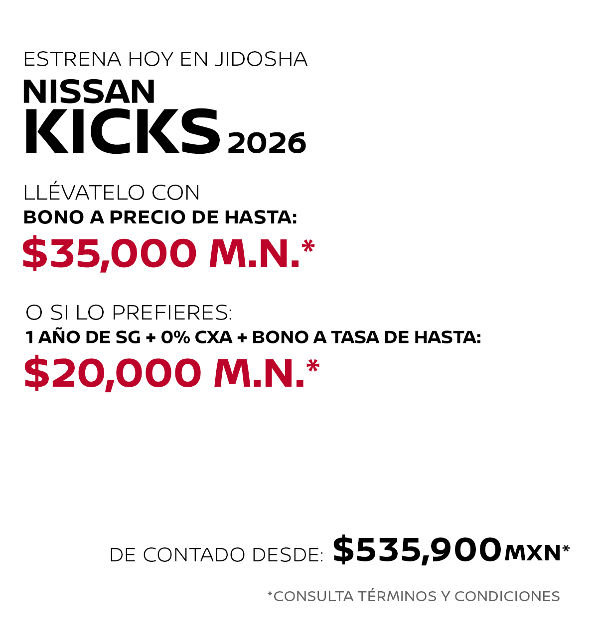 * Nissan Mexicana, S.A. de C.V. puede modificar en cualquier momento y sin previo aviso esta información, consulta disponibilidad, términos y condiciones con tu Distribuidor Autorizado Nissan. La información proporcionada en el piso de venta del distribuidor autorizado Nissan, se entenderá como la correcta, veraz y final. ** Las imágenes son únicamente de referencia, algunas versiones no se encuentran disponibles en México o pueden cambiar según la versión. Consulta nivel de equipamiento y disponibilidad por versión en tu Distribuidor Autorizado Nissan.