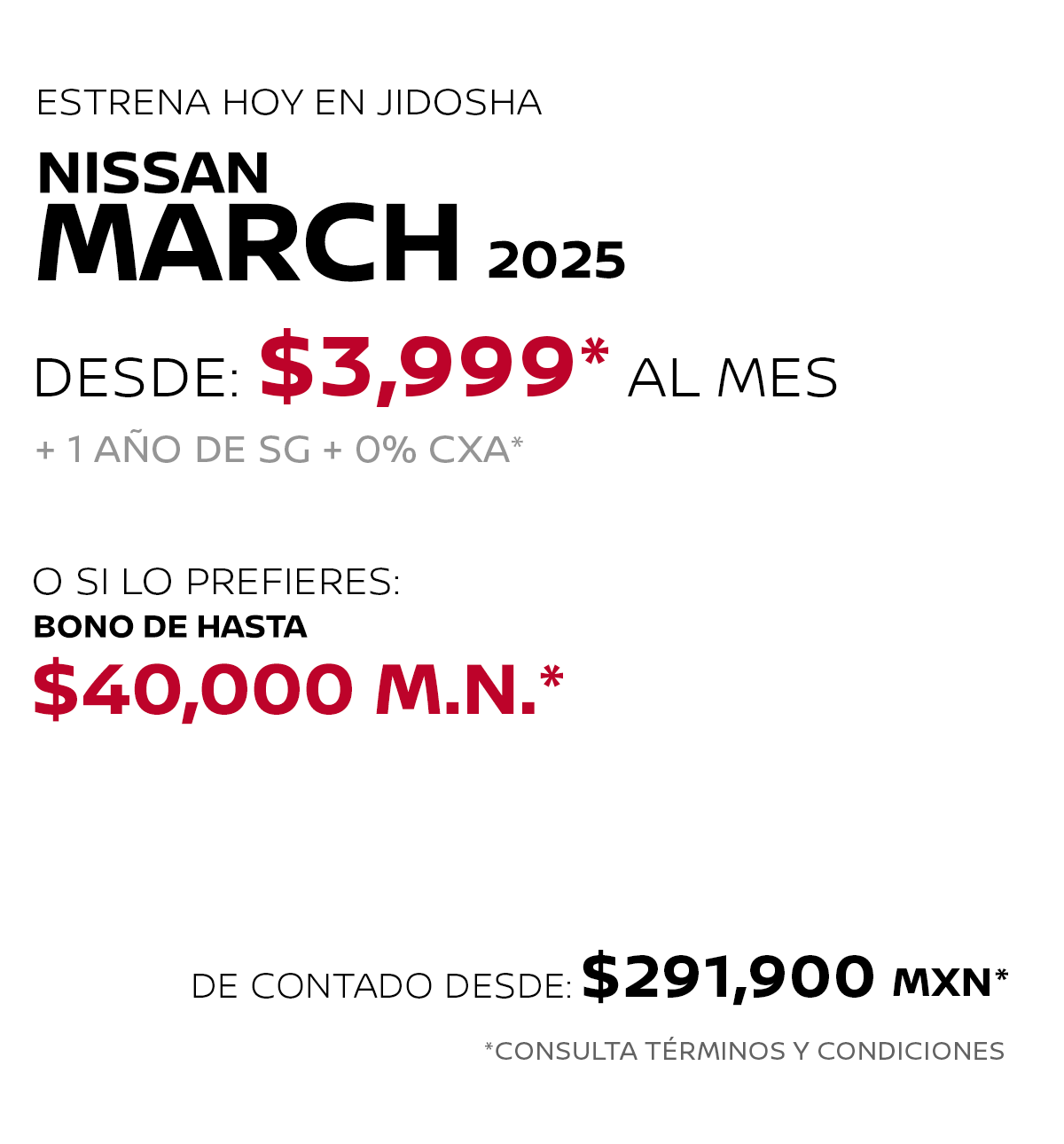 * Nissan Mexicana, S.A. de C.V. puede modificar en cualquier momento y sin previo aviso esta información, consulta disponibilidad, términos y condiciones con tu Distribuidor Autorizado Nissan. La información proporcionada en el piso de venta del distribuidor autorizado Nissan, se entenderá como la correcta, veraz y final. ** Las imágenes son únicamente de referencia, algunas versiones no se encuentran disponibles en México o pueden cambiar según la versión. Consulta nivel de equipamiento y disponibilidad por versión en tu Distribuidor Autorizado Nissan.