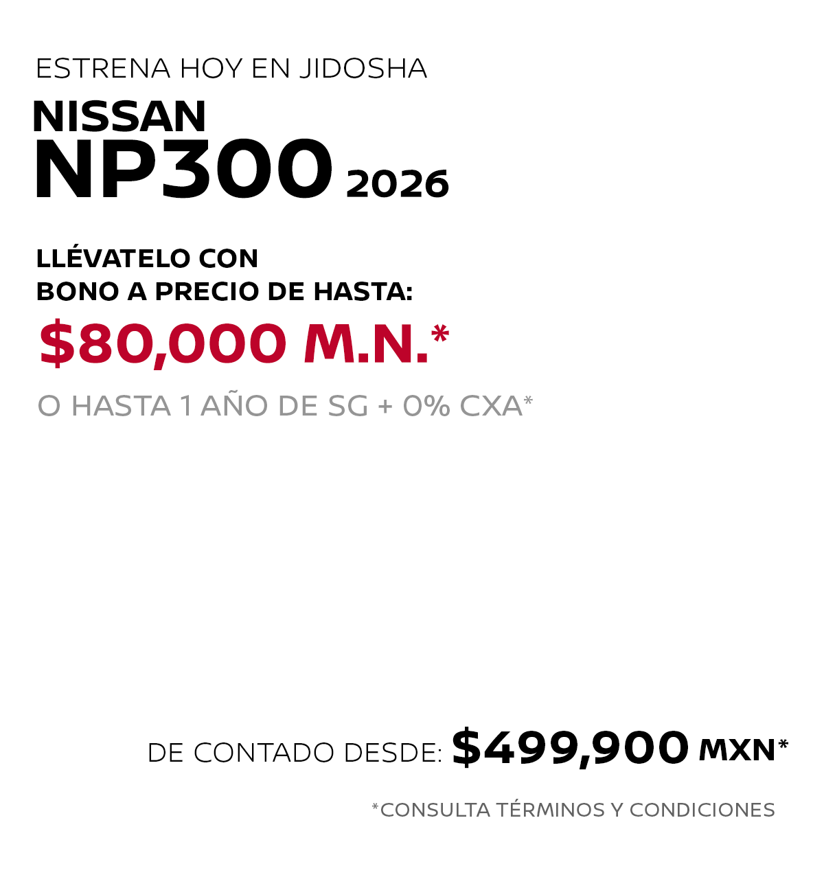 * Nissan Mexicana, S.A. de C.V. puede modificar en cualquier momento y sin previo aviso esta información, consulta disponibilidad, términos y condiciones con tu Distribuidor Autorizado Nissan. La información proporcionada en el piso de venta del distribuidor autorizado Nissan, se entenderá como la correcta, veraz y final. ** Las imágenes son únicamente de referencia, algunas versiones no se encuentran disponibles en México o pueden cambiar según la versión. Consulta nivel de equipamiento y disponibilidad por versión en tu Distribuidor Autorizado Nissan.