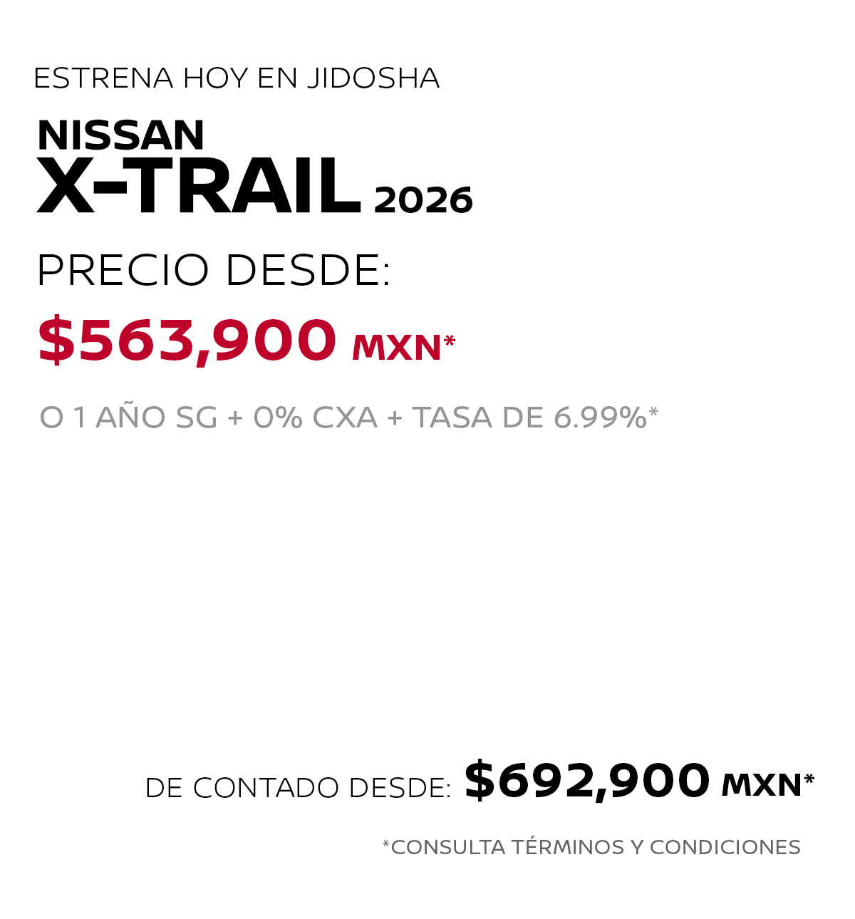 * Nissan Mexicana, S.A. de C.V. puede modificar en cualquier momento y sin previo aviso esta información, consulta disponibilidad, términos y condiciones con tu Distribuidor Autorizado Nissan. La información proporcionada en el piso de venta del distribuidor autorizado Nissan, se entenderá como la correcta, veraz y final. ** Las imágenes son únicamente de referencia, algunas versiones no se encuentran disponibles en México o pueden cambiar según la versión. Consulta nivel de equipamiento y disponibilidad por versión en tu Distribuidor Autorizado Nissan.