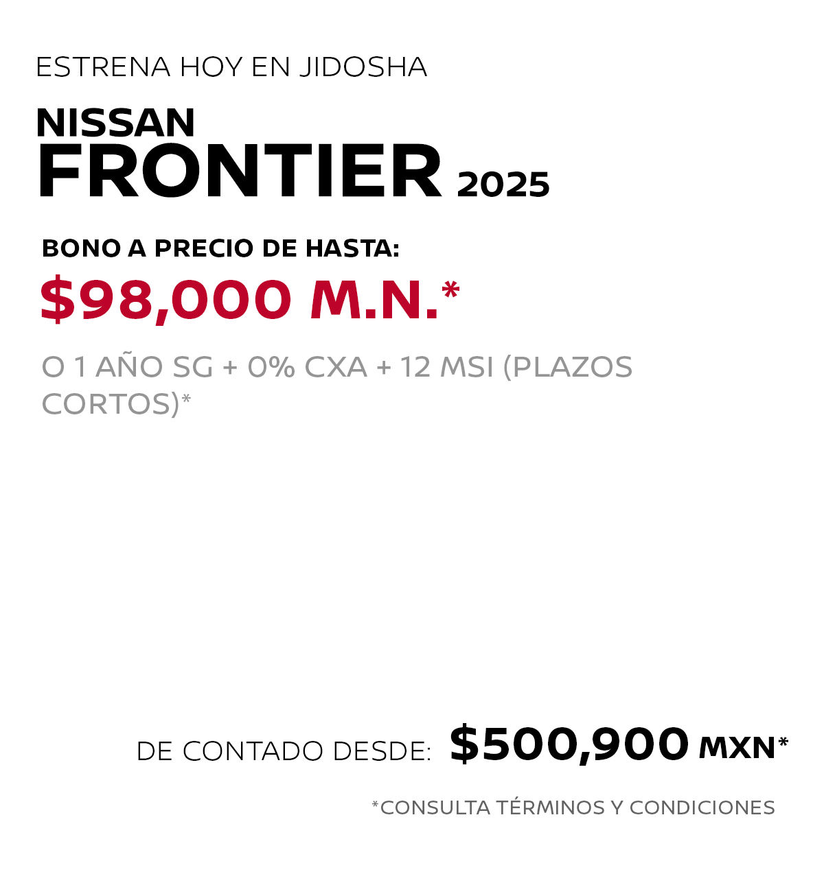 * Nissan Mexicana, S.A. de C.V. puede modificar en cualquier momento y sin previo aviso esta información, consulta disponibilidad, términos y condiciones con tu Distribuidor Autorizado Nissan. La información proporcionada en el piso de venta del distribuidor autorizado Nissan, se entenderá como la correcta, veraz y final. ** Las imágenes son únicamente de referencia, algunas versiones no se encuentran disponibles en México o pueden cambiar según la versión. Consulta nivel de equipamiento y disponibilidad por versión en tu Distribuidor Autorizado Nissan.