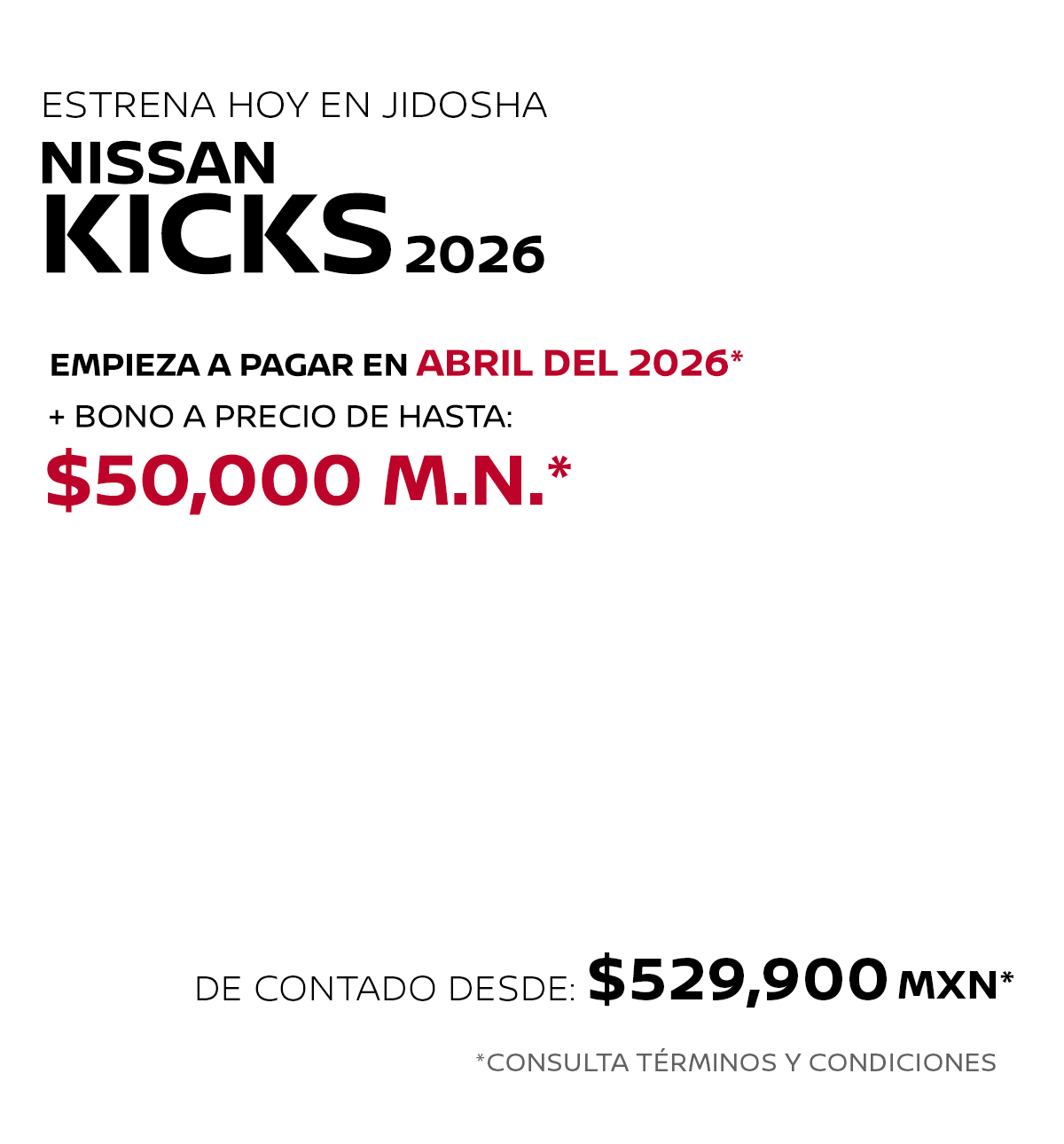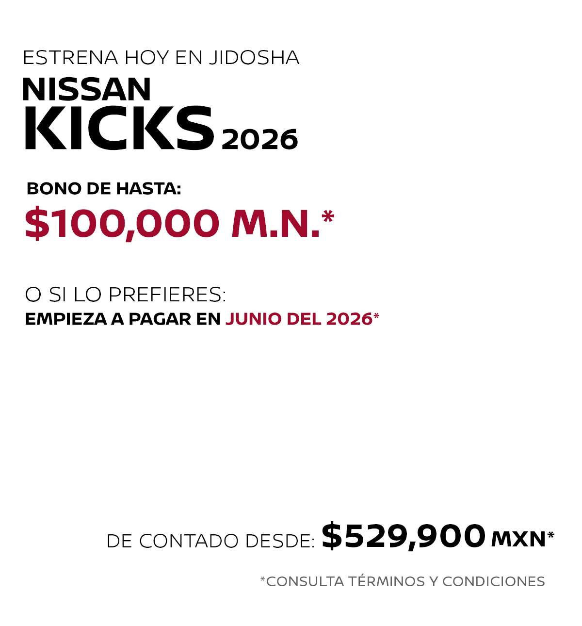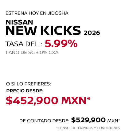 * Nissan Mexicana, S.A. de C.V. puede modificar en cualquier momento y sin previo aviso esta información, consulta disponibilidad, términos y condiciones con tu Distribuidor Autorizado Nissan. La información proporcionada en el piso de venta del distribuidor autorizado Nissan, se entenderá como la correcta, veraz y final. ** Las imágenes son únicamente de referencia, algunas versiones no se encuentran disponibles en México o pueden cambiar según la versión. Consulta nivel de equipamiento y disponibilidad por versión en tu Distribuidor Autorizado Nissan.