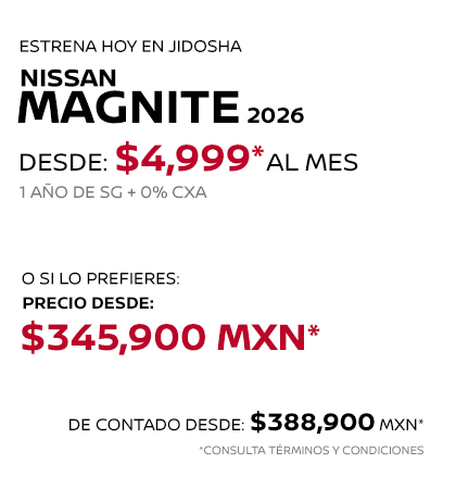 * Nissan Mexicana, S.A. de C.V. puede modificar en cualquier momento y sin previo aviso esta información, consulta disponibilidad, términos y condiciones con tu Distribuidor Autorizado Nissan. La información proporcionada en el piso de venta del distribuidor autorizado Nissan, se entenderá como la correcta, veraz y final. ** Las imágenes son únicamente de referencia, algunas versiones no se encuentran disponibles en México o pueden cambiar según la versión. Consulta nivel de equipamiento y disponibilidad por versión en tu Distribuidor Autorizado Nissan.