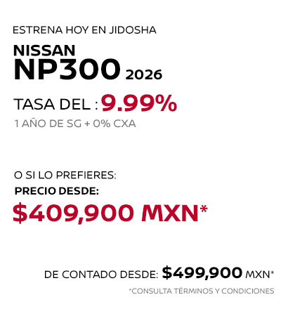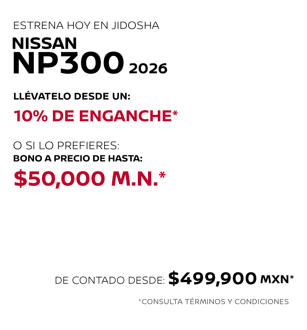 * Nissan Mexicana, S.A. de C.V. puede modificar en cualquier momento y sin previo aviso esta información, consulta disponibilidad, términos y condiciones con tu Distribuidor Autorizado Nissan. La información proporcionada en el piso de venta del distribuidor autorizado Nissan, se entenderá como la correcta, veraz y final. ** Las imágenes son únicamente de referencia, algunas versiones no se encuentran disponibles en México o pueden cambiar según la versión. Consulta nivel de equipamiento y disponibilidad por versión en tu Distribuidor Autorizado Nissan.