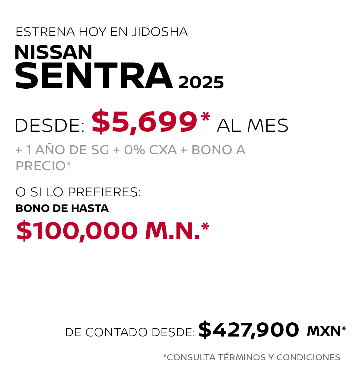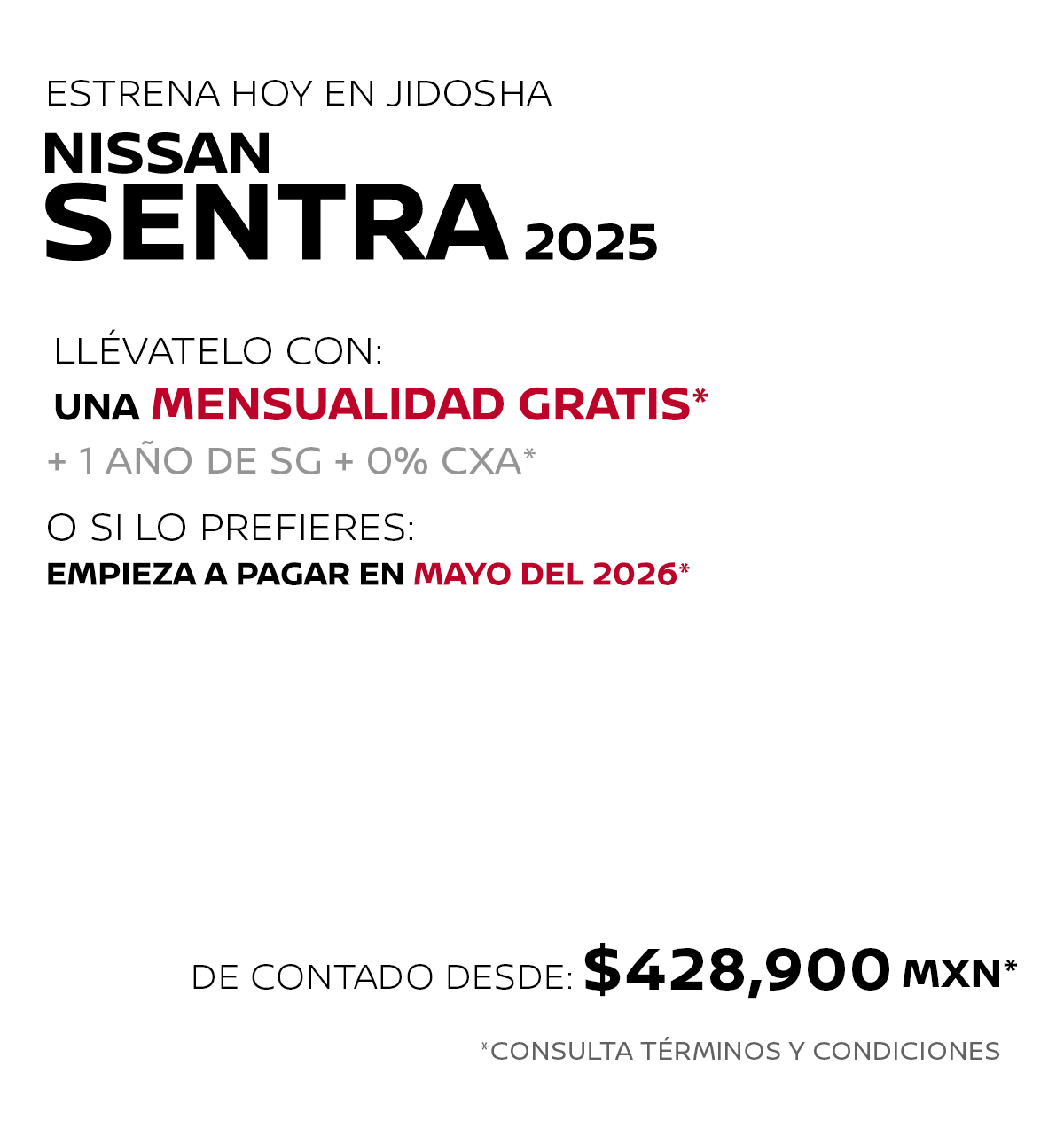 * Nissan Mexicana, S.A. de C.V. puede modificar en cualquier momento y sin previo aviso esta información, consulta disponibilidad, términos y condiciones con tu Distribuidor Autorizado Nissan. La información proporcionada en el piso de venta del distribuidor autorizado Nissan, se entenderá como la correcta, veraz y final. ** Las imágenes son únicamente de referencia, algunas versiones no se encuentran disponibles en México o pueden cambiar según la versión. Consulta nivel de equipamiento y disponibilidad por versión en tu Distribuidor Autorizado Nissan.