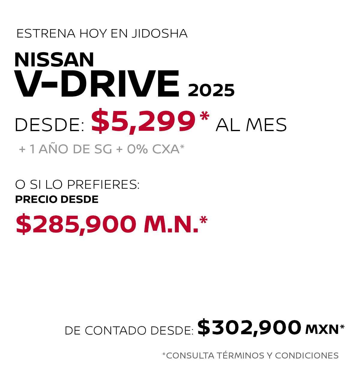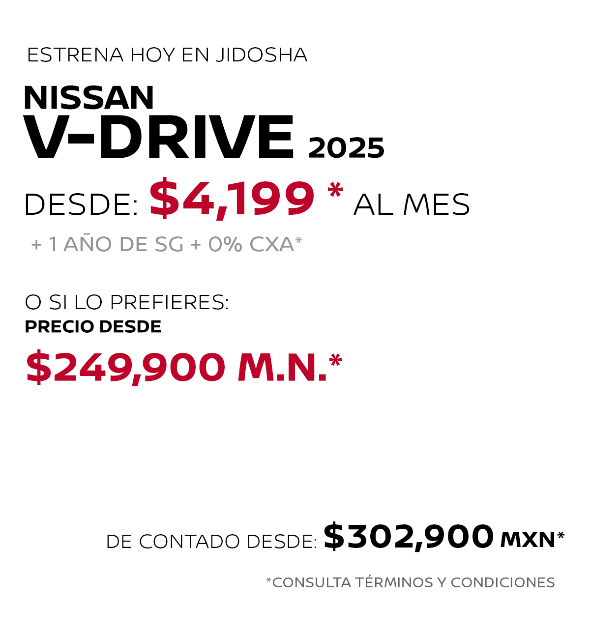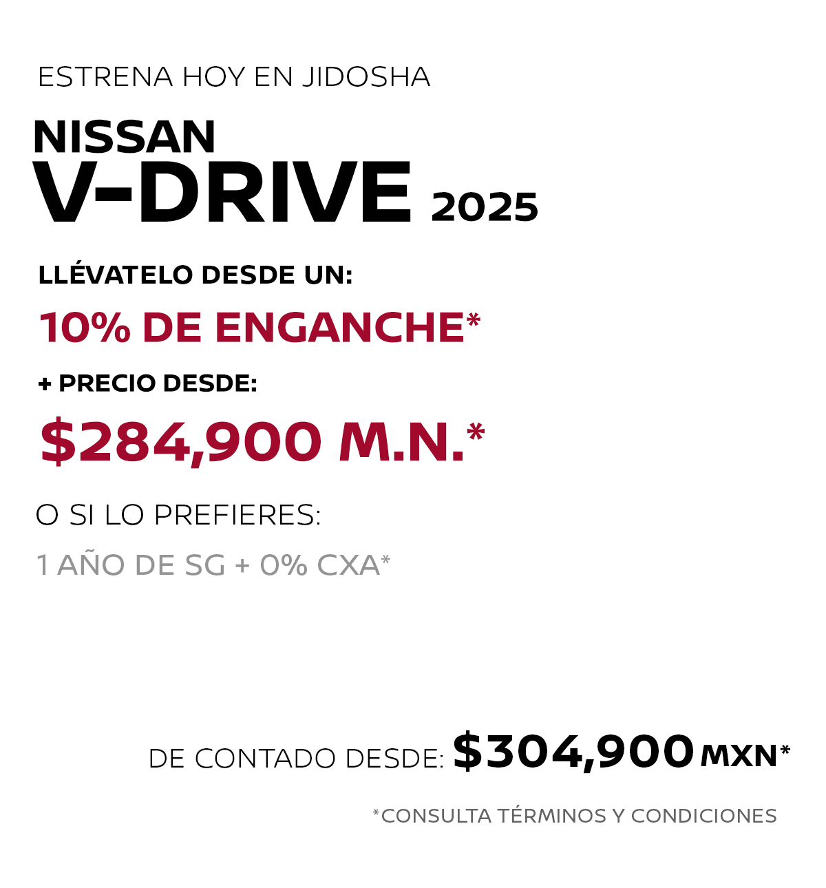 * Nissan Mexicana, S.A. de C.V. puede modificar en cualquier momento y sin previo aviso esta información, consulta disponibilidad, términos y condiciones con tu Distribuidor Autorizado Nissan. La información proporcionada en el piso de venta del distribuidor autorizado Nissan, se entenderá como la correcta, veraz y final. ** Las imágenes son únicamente de referencia, algunas versiones no se encuentran disponibles en México o pueden cambiar según la versión. Consulta nivel de equipamiento y disponibilidad por versión en tu Distribuidor Autorizado Nissan.