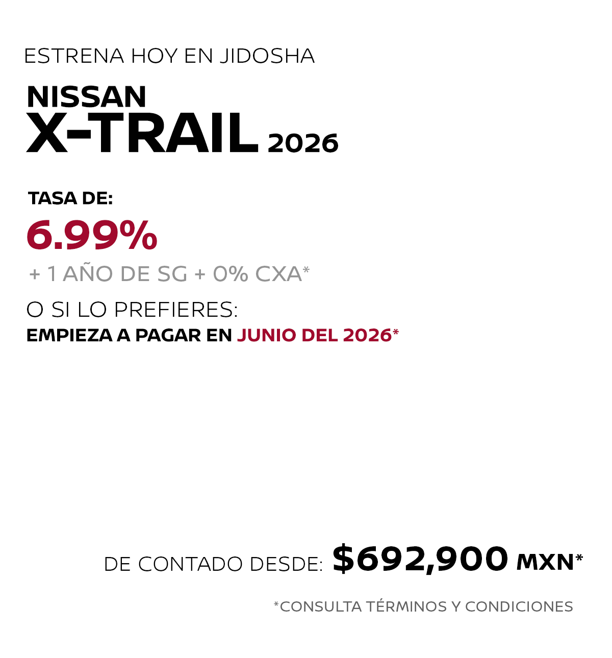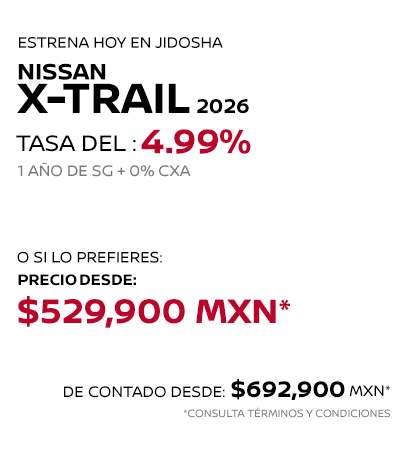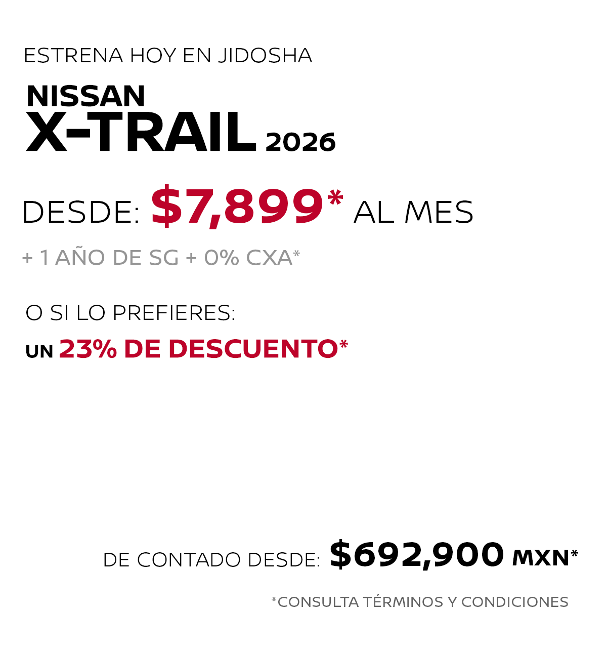 * Nissan Mexicana, S.A. de C.V. puede modificar en cualquier momento y sin previo aviso esta información, consulta disponibilidad, términos y condiciones con tu Distribuidor Autorizado Nissan. La información proporcionada en el piso de venta del distribuidor autorizado Nissan, se entenderá como la correcta, veraz y final. ** Las imágenes son únicamente de referencia, algunas versiones no se encuentran disponibles en México o pueden cambiar según la versión. Consulta nivel de equipamiento y disponibilidad por versión en tu Distribuidor Autorizado Nissan.