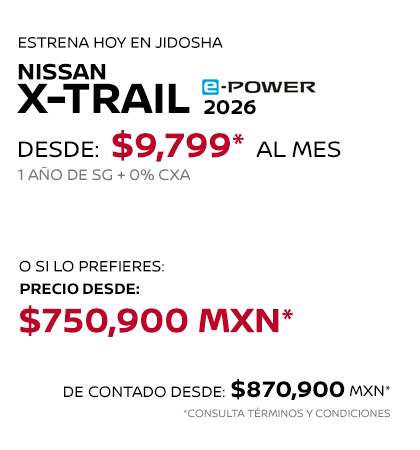 * Nissan Mexicana, S.A. de C.V. puede modificar en cualquier momento y sin previo aviso esta información, consulta disponibilidad, términos y condiciones con tu Distribuidor Autorizado Nissan. La información proporcionada en el piso de venta del distribuidor autorizado Nissan, se entenderá como la correcta, veraz y final. ** Las imágenes son únicamente de referencia, algunas versiones no se encuentran disponibles en México o pueden cambiar según la versión. Consulta nivel de equipamiento y disponibilidad por versión en tu Distribuidor Autorizado Nissan.